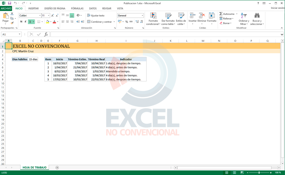 La fecha estimada para que la actividad sea atendida es de 15 días hábiles. Teniendo como dato la fecha de inicio la fecha de término estimada puede ser calculada con la función DIA.LAB. Por otro lado, se debe indicar la cantidad de días antes de tiempo o fuera de tiempo en que la actividad fue atendida, para lo cual utilizaríamos la función DIAS.LAB.